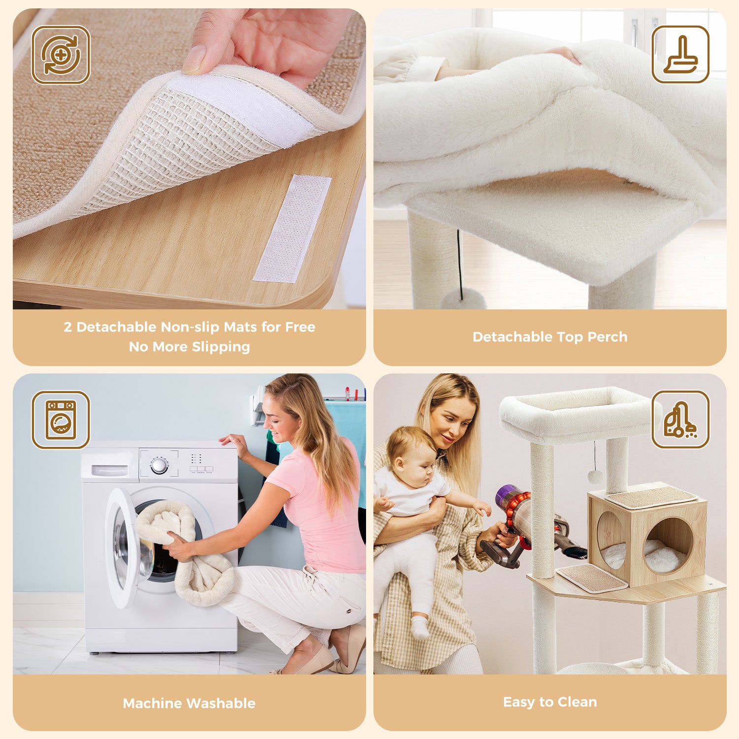 PETEPELA Arbre à chats en bois pour chats d'appartement - Tour à plusieurs niveaux avec poteaux de grattage en sisal, maison de repos confortable, hamac XXL et plateformes douillettes en pelage de lapin en tissu (beige)