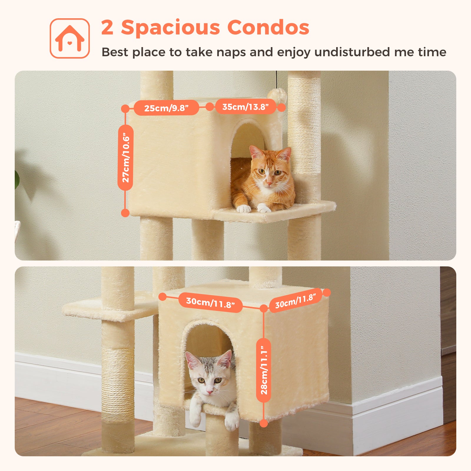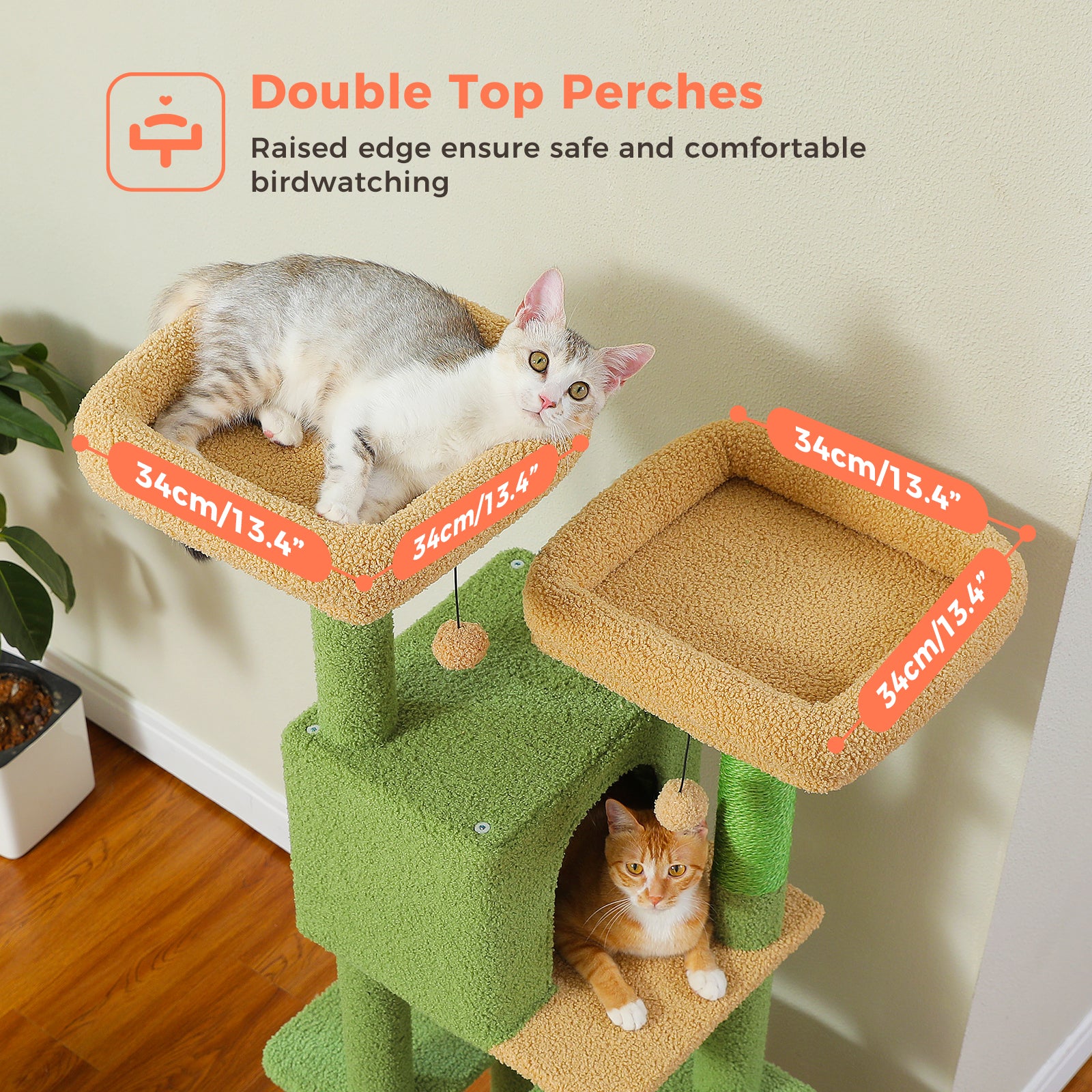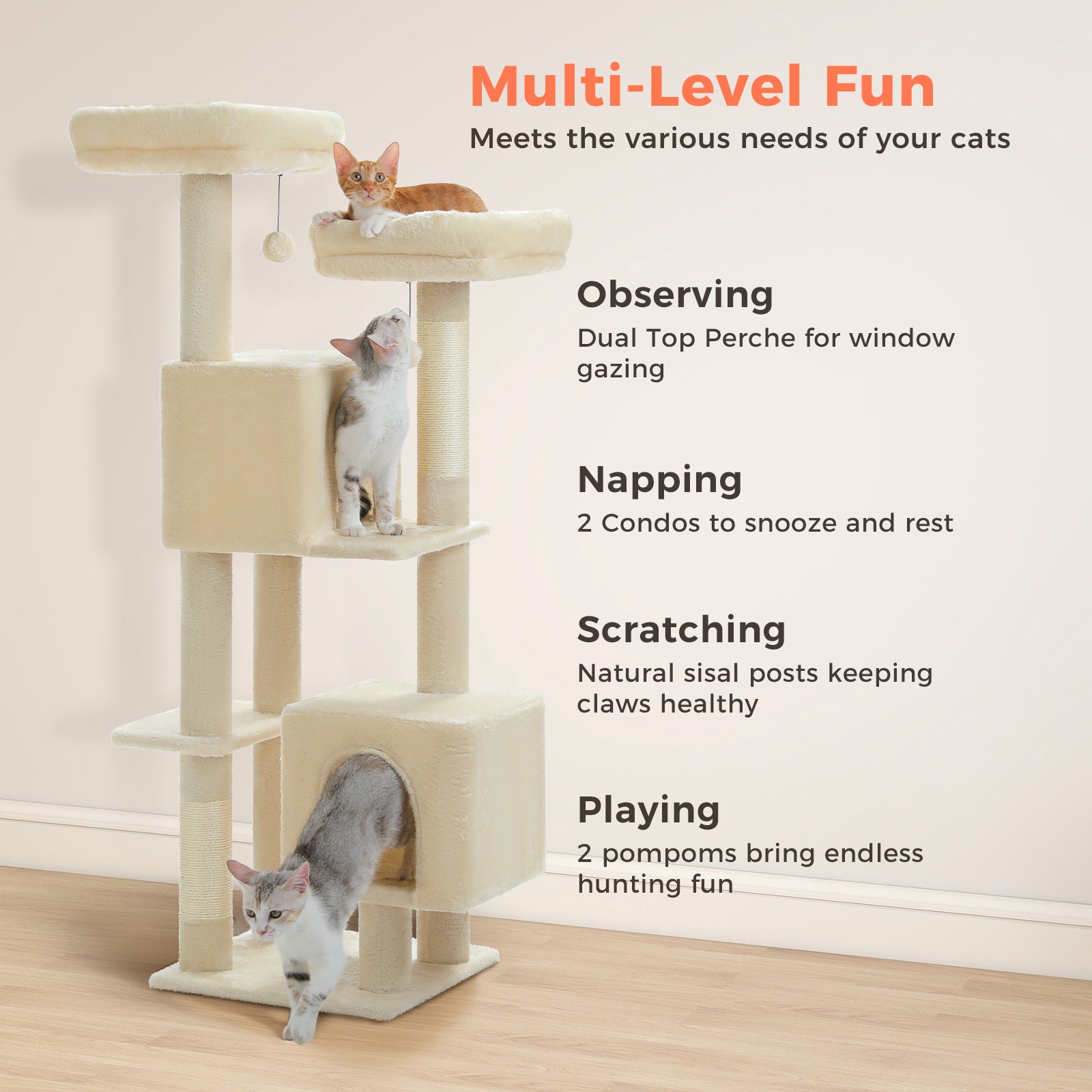 PAWZ Road Kratzbaum, 133 cm mehrstufiger Katzenbaum für Wohnungskatzen, plüschiges Katzenhaus mit 2 gepolsterten Liegeflächen, 2 Schlafhäusern & 2 Kratzpfeilern