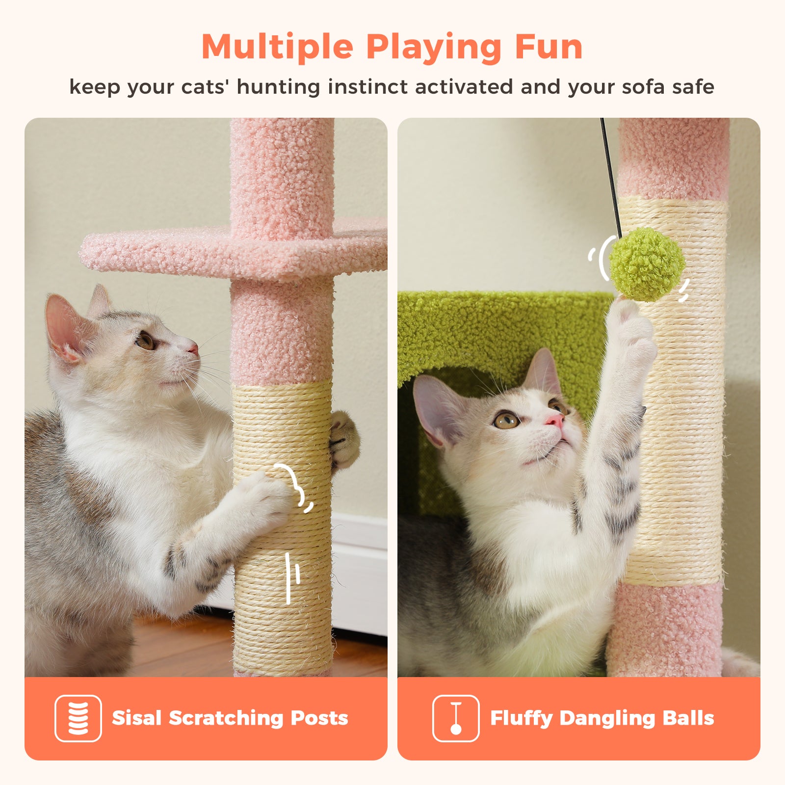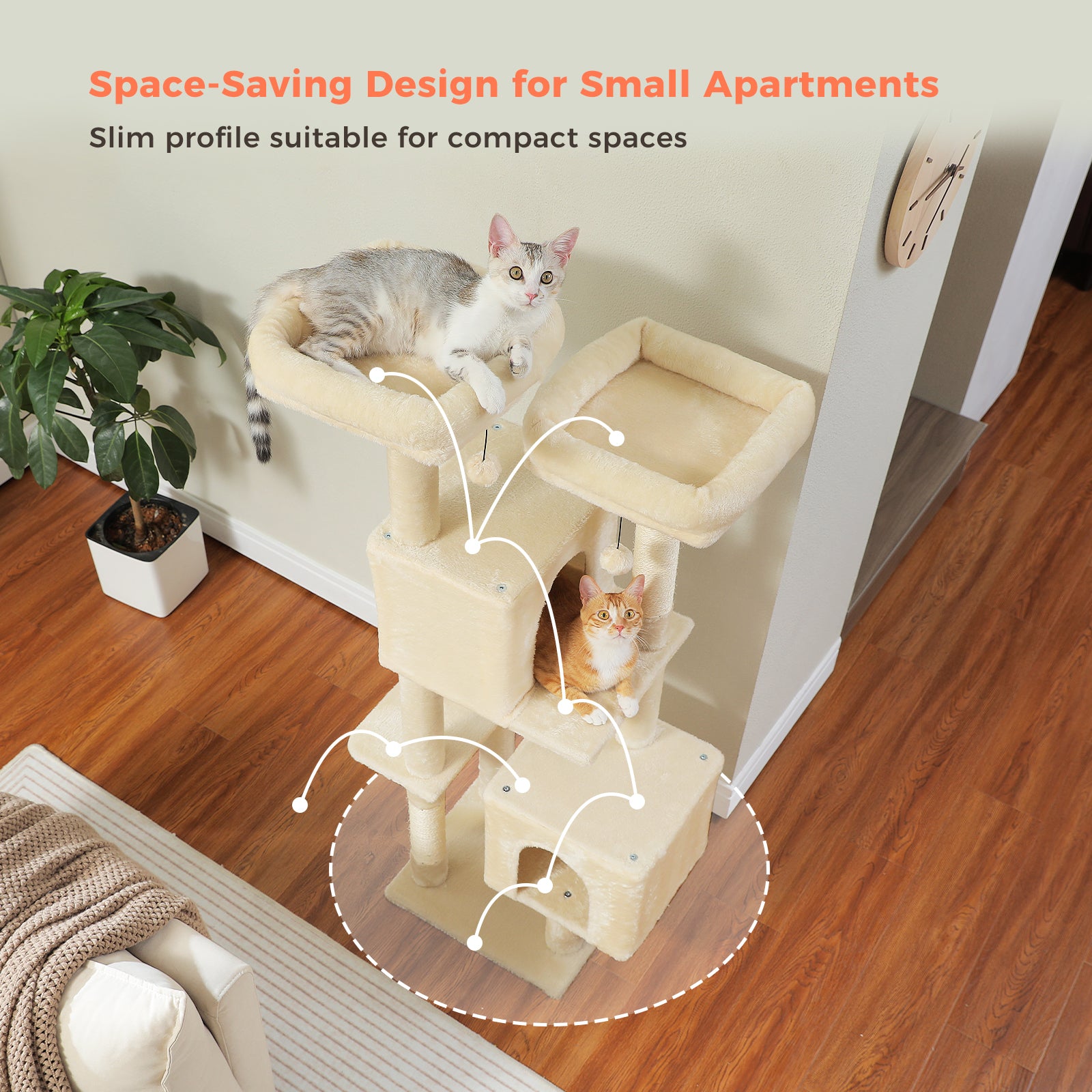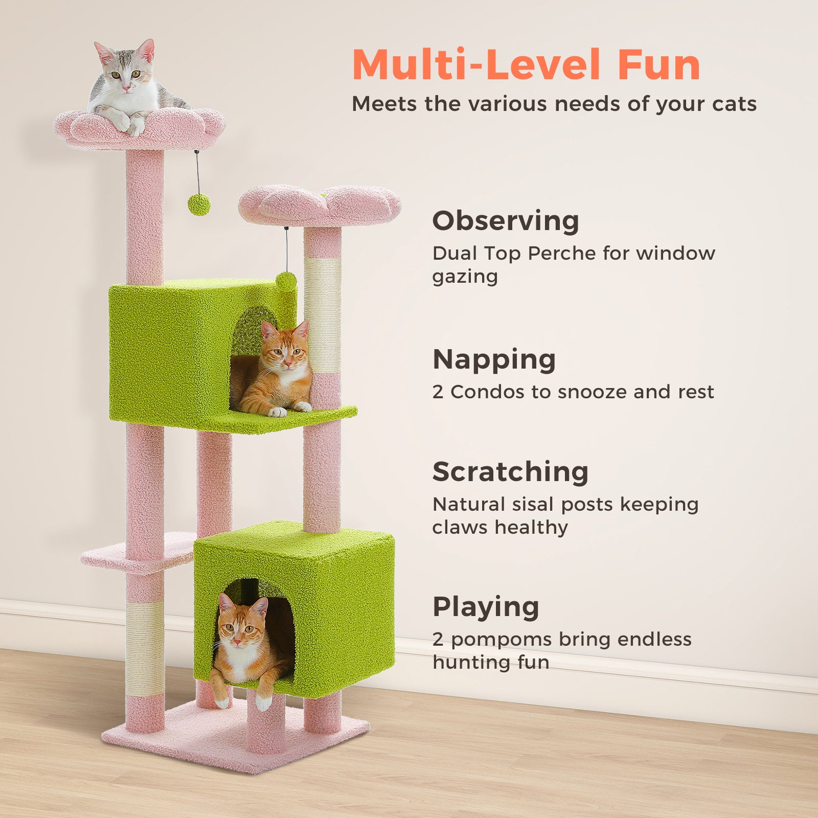 PAWZ Road Kratzbaum, 133 cm mehrstufiger Katzenbaum für Wohnungskatzen, plüschiges Katzenhaus mit 2 gepolsterten Liegeflächen, 2 Schlafhäusern & 2 Kratzpfeilern